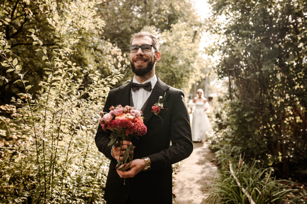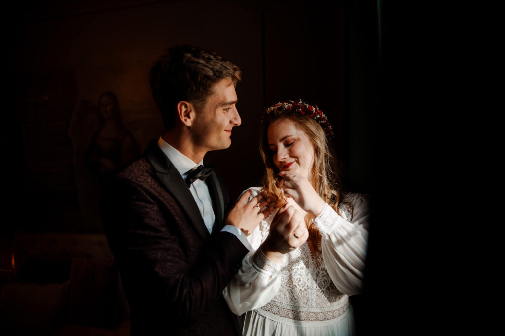 Dobrze jest wybrać na niego już wcześniej jakieś miejsce, najlepiej w ogrodzie. Pan Młody stoi tyłem i czeka w napięci. Panna Młoda dochodzi i zakrywa mu oczy, a później się odwracacie. Później już ja chwytam wasze emocje, pocałunki, uśmiechy i wzruszenia po przez kadry. Dla bardziej romantycznych par, bardzo fajnym pomysłem jest też napisanie sobie listów miłosnych i przeczytanie ich sobie nawzajem.
